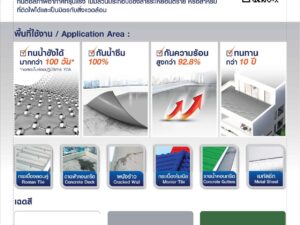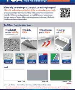 ทีโอเอ พียู วอเตอร์พรูฟ เป็นวัสดุกันรั่วซึม ชนิดโพลียูริเทนสูตรน้ำสำเร็จรูป พร้อมใช้งาน กันน้ำรั่วซึม 100 % เหมาะสำหรับงานกันซึมภายในและภายนอกอาคาร เช่น ทาเคลือบผิวคอนกรีต หลังคา ดาดฟ้า มีความยืดหยุ่นตัวสูง 800 % ไร้รอยต่อ ช่วยปกปิดรอยแตกร้าว ทนทานต่อสารเคมี แสงแดด และสภาพอากาศที่รุนแรง ไม่มีส่วนประกอบของสารระเหยอันตราย เป็นมิตรต่อสิ่งแวดล้อม